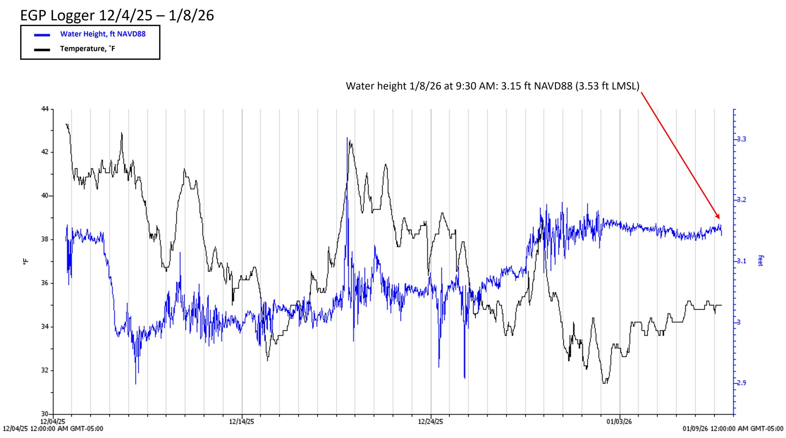 Figure 1: Readout of Edgartown Great Pond elevation data relative to NAVD88 from December 4th 2025 to January 8th 2026. Black line representing elevation and blue line representing water temperature. The pond’s latest elevation (on 1/8/26) was recorded at 3.53 feet above local mean sea level.