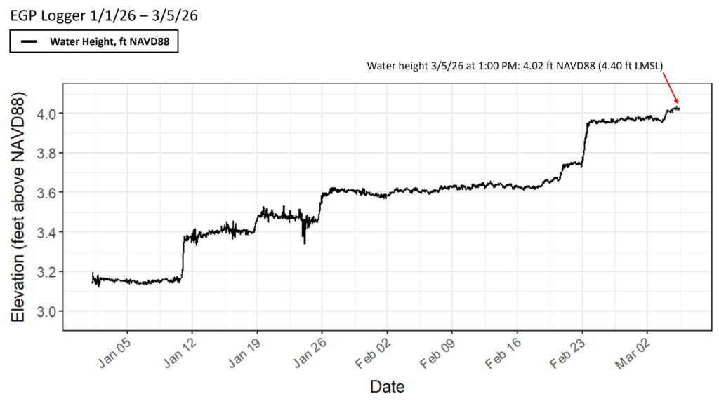 Figure 1: Readout of Edgartown Great Pond elevation data relative to NAVD88 from January 1st 2026 to March 5th 2026. The pond’s latest elevation (on 3/5/26) was recorded at 4.40 feet above local mean sea level.